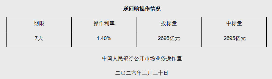 3月30日电 据央止网站新闻,2026年3月30日中原群众银止以牢固利率、数目投标体例启铺了2695亿元7天期顺归买操纵。详细环境以下:图源:央止网站截图